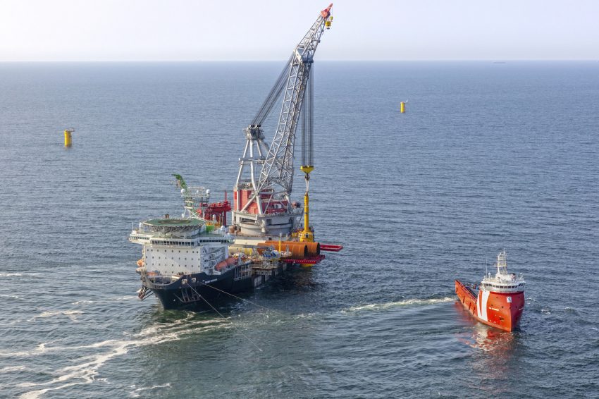 While smaller parts for Hollandse Kust Zuid are stored in IJmuiden and shipped from there, the foundations and secondary steel components are shipped from foundation manufacturer Sif’s yard on the Maasvlakte by the installation vessel Seaway Strashnov. This ship has a crane that lifts the monopile into the water and lowers the foundations until it reaches the seabed at a depth of 17-28 metres. Once the foundation is in position on the seabed, a hydraulic impact hammer is used to drive the pile to the final penetration depth.